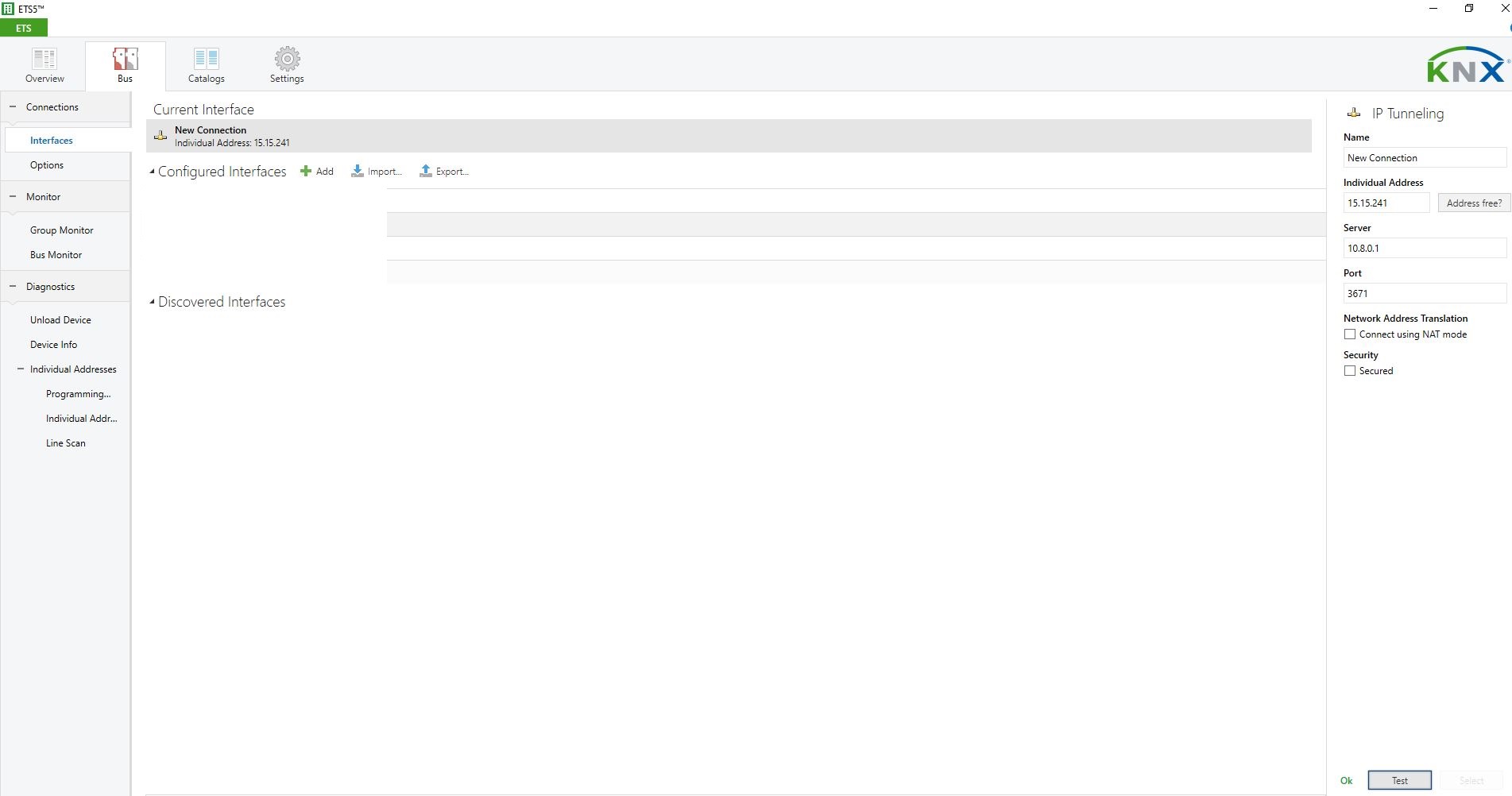Since Thinka device has built-in KNX IP interface (IP Interface should be enabled to use), you can use 10.8.0.1 in ETS to access knx network