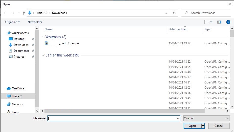 Thinka has started the built-in VPN server and created client certificate. Download this certificate by clicking the Download VPN File button. This will download the certificate that you will use to connect later.