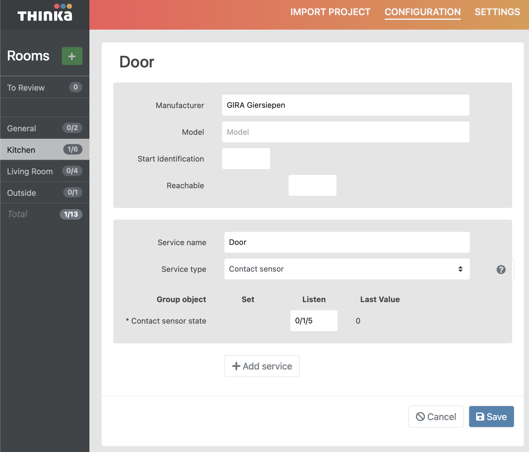 A Contact Sensor is mostly used to detect if a door or window is opened. A single group address needs to be configured. You can receive notifications when the sensor makes contact and create automations based on these notifications in the Home app. It can automatically turn on a light for example.