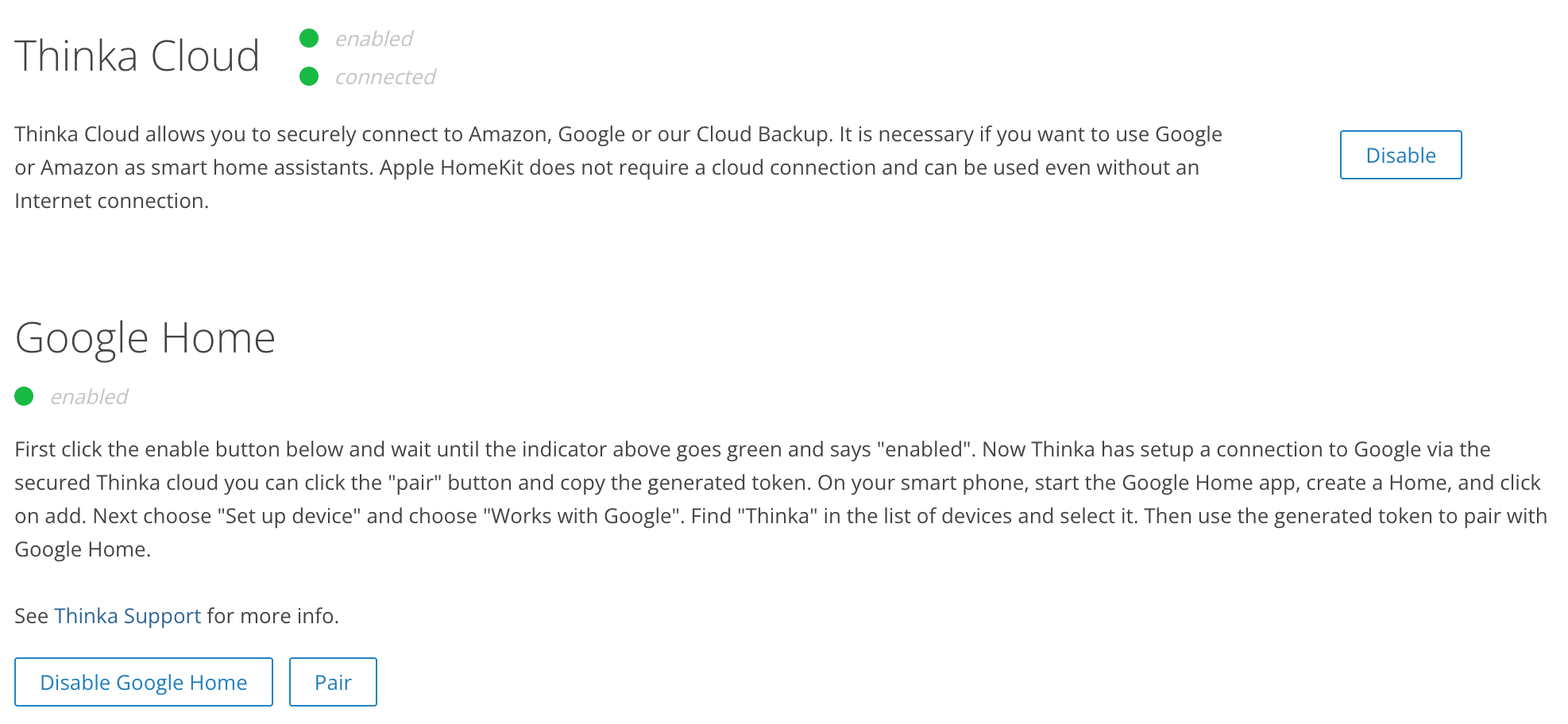 Enable Google Home from the settings page on your Thinka. Doing so you allow the Thinka to setup a connection to Google via the secured Thinka cloud.