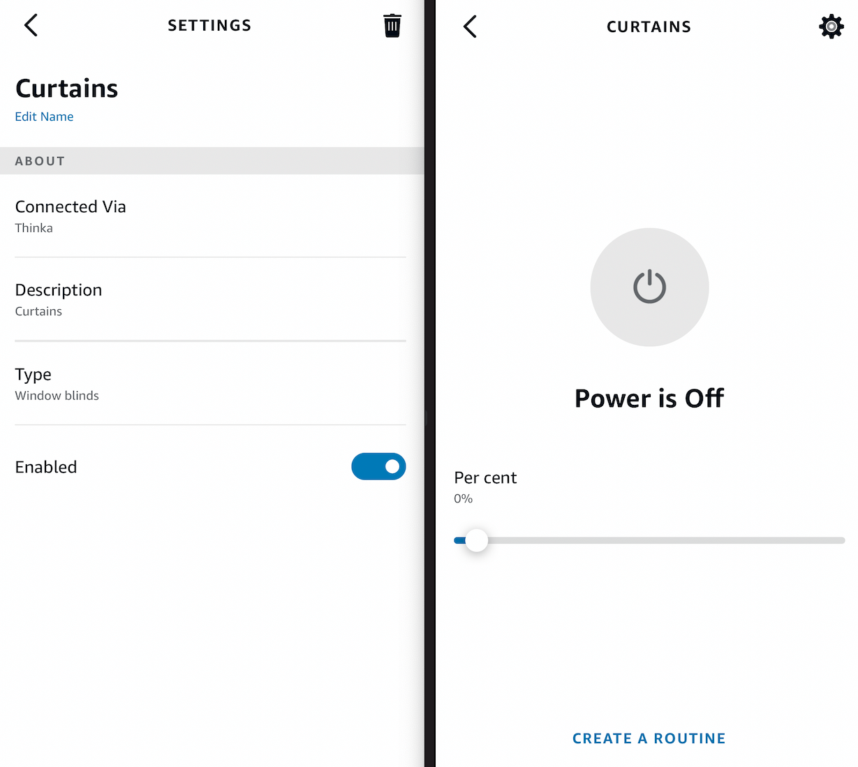 When using WindowCoverings in Alexa, the App shows just information, no controls (see below left). This is a serious limitation, since you can not use it to open or close the curtain. And you can not use it in an automation.